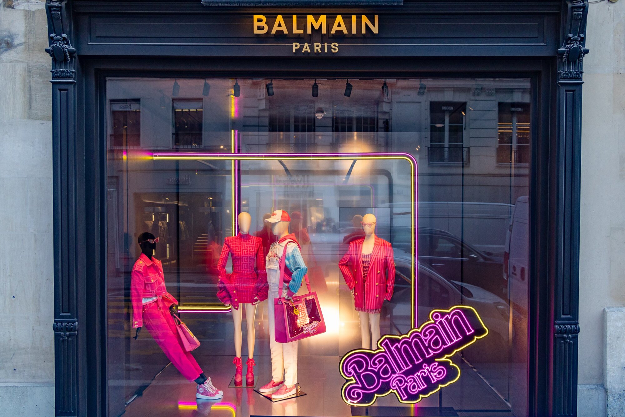 A Balmain üzlet kirakata Párizsban, ahol a Balmain x Barbie kollekció látható