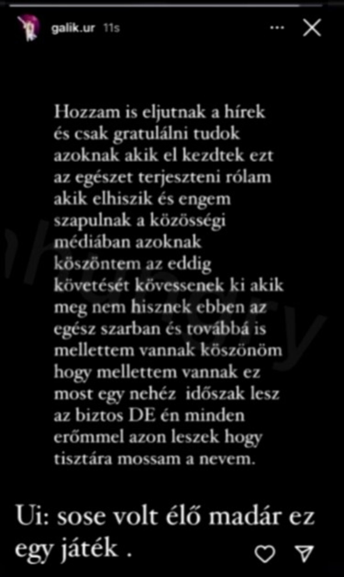 A történések olyan gyorsan eszkalálódtak, hogy Gálik úr kénytelen volt megszólalni a vele kapcsolatos hipotézisekről. Mindezt egy instasztoriban tette, amiben először tagadta, majd aztán igazából beismerte, hogy ő szerepelt a videóban postscriptumban hangsúlyozva, hogy „sose volt élő madár ez játék“.