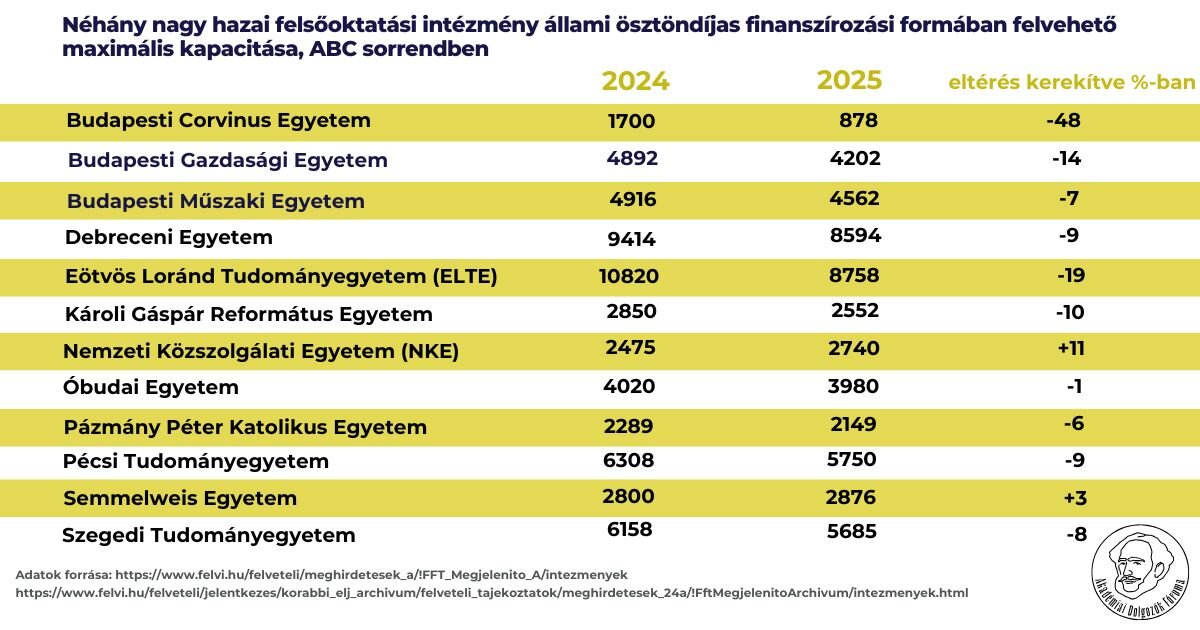 A Magyar Tudományos Akadémiától elszakított kutatóhálózatok tudósainak mozgalmaként működő Akadémiai Dolgozók Fóruma Facebookon hívta fel a figyelmet arra, hogy a 2025 őszén kezdődő tanévtől gyakorlatilag az összes hazai egyetemen hirtelen és jelentősen csökkentik az állami finanszírozású felsőoktatási helyek számát.