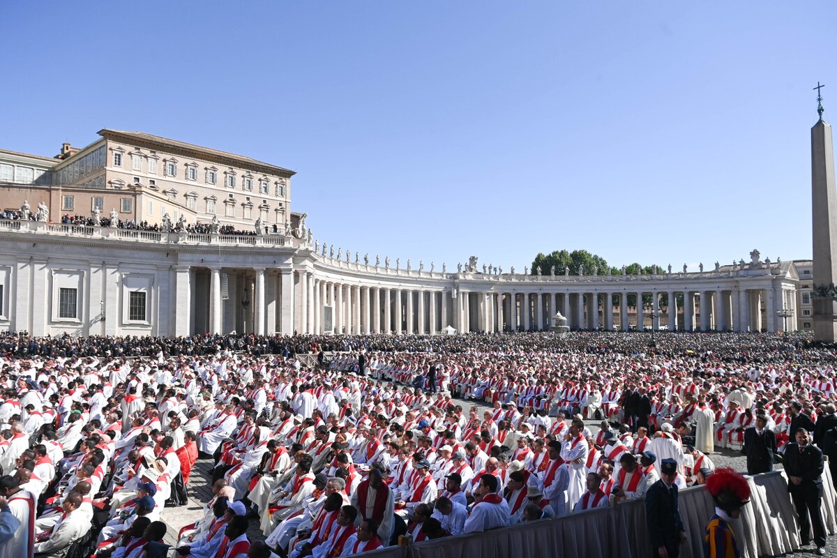 A vatikáni Szent Péter-bazilika előtti téren – ahol a becslések szerint körülbelül kétszázezren gyűltek össze – 980-an koncelebráltak, bíborosok, püspökök és papok, továbbá 200 áldoztató teljesített szolgálatot, és több mint négyezer pap volt jelen. A szertartást vezető Giovanni Battista Re bíboros, a bíborosi kollégium dékánjának homíliája után a francia, arab, portugál, lengyel, német és kínai nyelven elhangzott egyetemes könyörgések Ferenc pápáért, az egyházért, minden nemzetért és a korábbi pápákért szóltak.