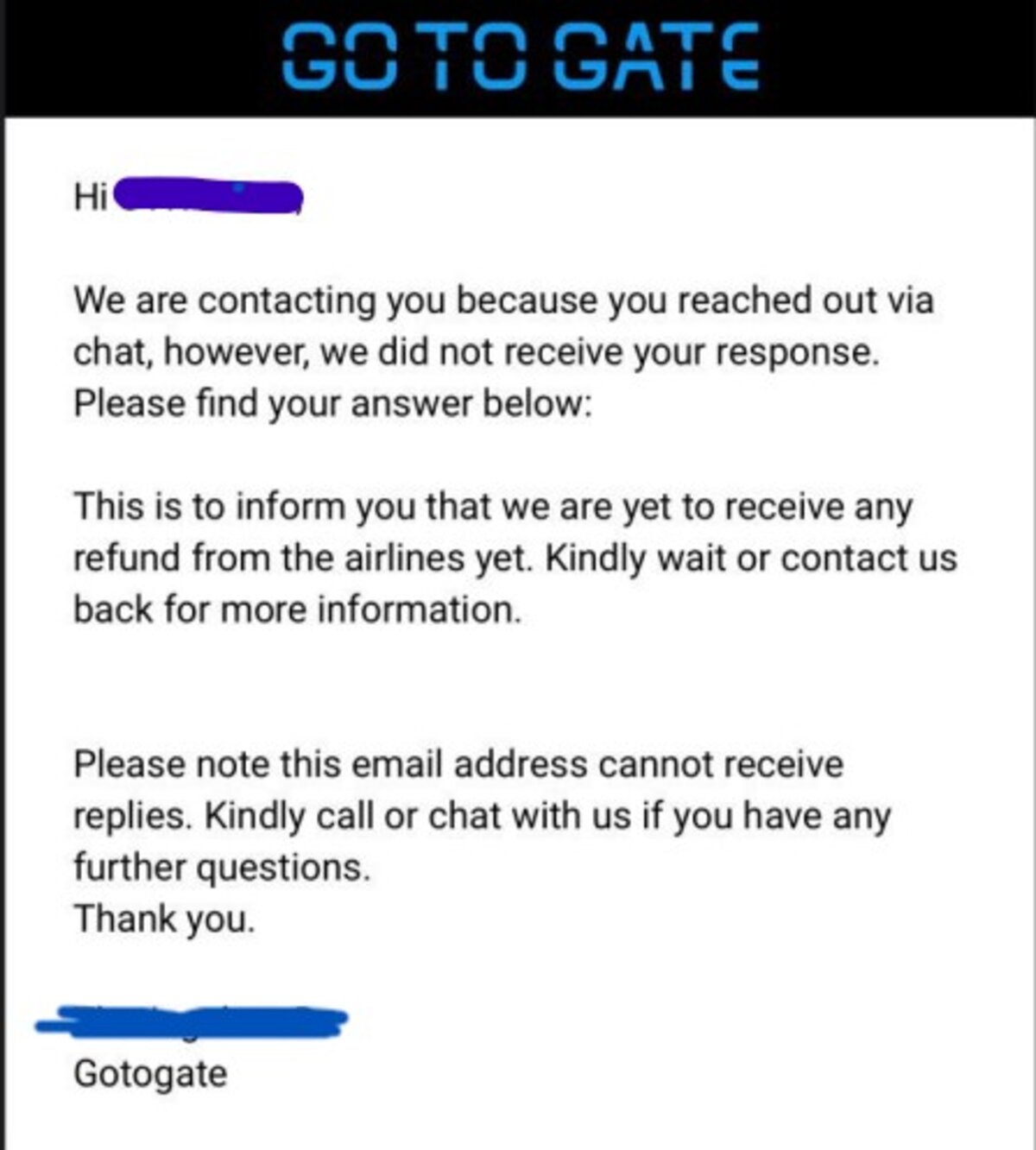 Z. hiába fordult a Gotogate-hez, és kérte számon őket, a szolgáltató folyamatosan tagadta felelősségét. A hivatalos panaszbejelentő e-mailjeit letiltották, az ügyfélszolgálaton pedig nem válaszoltak neki. Miután Z. Trustpiloton megosztotta véleményét, tapasztalatait, és óva intette az utazókat attól, hogy igénybe vegyék az oldal szolgáltatásait, a poszt alá érkezett egy sablonos válasz a Gotogate-től, melyben megkérték, hogy tartózkodjon a rendelésszám közzétételétől, majd bocsánatot kértek tőle a kellemetlenségekért. Z. mindezek után hivatalos jogi panaszt küldött az Etraveli Groupnak, a Gotogate anyavállalatának, értesítette a Skyscannert, amely elismerte a problémát, és felvette a kapcsolatot közvetlenül a Gotogate-tel.