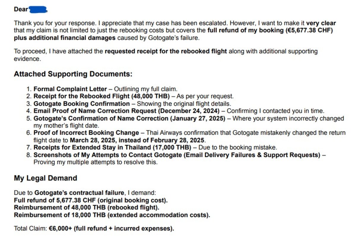Z. szintén nemzetközi járatra vásárolt jegyeket az oldalon, magának és idős szüleinek. Zürichből utaztak volna Bangkokba, majd onnan Chiang Maiba. A foglalás után nem sokkal vette észre, hogy anyukája nevéből egy betűt kihagytak, így 2024. december 24-én kérvényezte is a névmódosítást, ezért a Gotogate neki is szolgáltatási díjat számolt fel. Azonban a szolgáltatónak több hét után sem sikerült feldolgoznia kérését, így Z. egyenesen a járatot üzemeltető Thai Airways-hez fordult. Tőlük azt az információt kapta, hogy mivel nem közvetlenül a légitársaság oldalán vette a jegyet, így nincsenek felruházva a névmódosításra. Bár a Gotogate értékesítette a jegyet, s így csak ők tudták volna módosítani a foglalási adatokat, ezt nem tették meg az utazás napjáig.